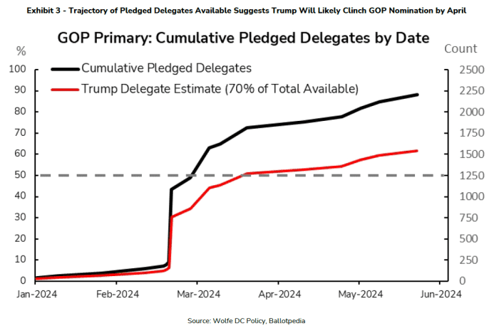 Wolfe Research provided an assessment of this question as shown in the chart below. The chart shows “the cumulative percentage of delegates awarded as the nomination calendar continues, along with the approximate ballpark that Trump's delegate count might track if he wins about 70% of delegates, representing a combination of winner-take-all wins and victories,” Tobin Marcus said. “Narrow majorities or strong pluralities in states where Haley is doing well,” Wolff’s head of politics and politics.