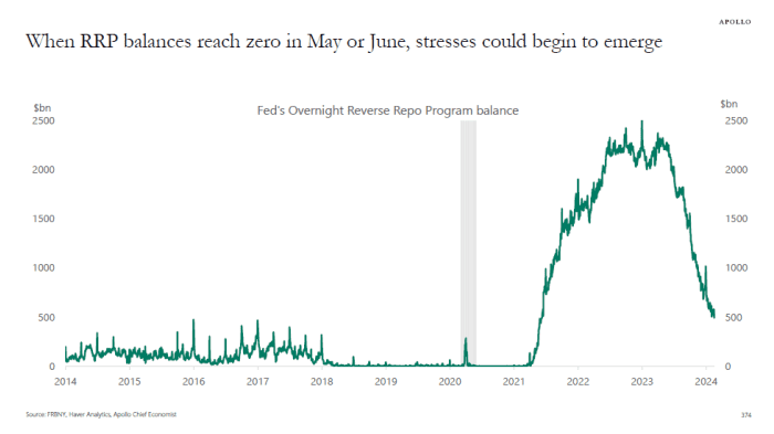 There may be a bumpy road ahead, says Torsten Slok, chief economist at private equity giant Apollo Global Management. As the Fed continues its quantitative tightening program, the level of reserve repurchase agreements may reach zero in May or June. “The concern is that once there are no longer abundant reserves in the banking sector, reserves will be scarce, and the consequences could be reduced support for T-bills, duration, and credit markets, or pressures in money markets similar to what we are now in,” says Slok. “We saw in September 2019″.